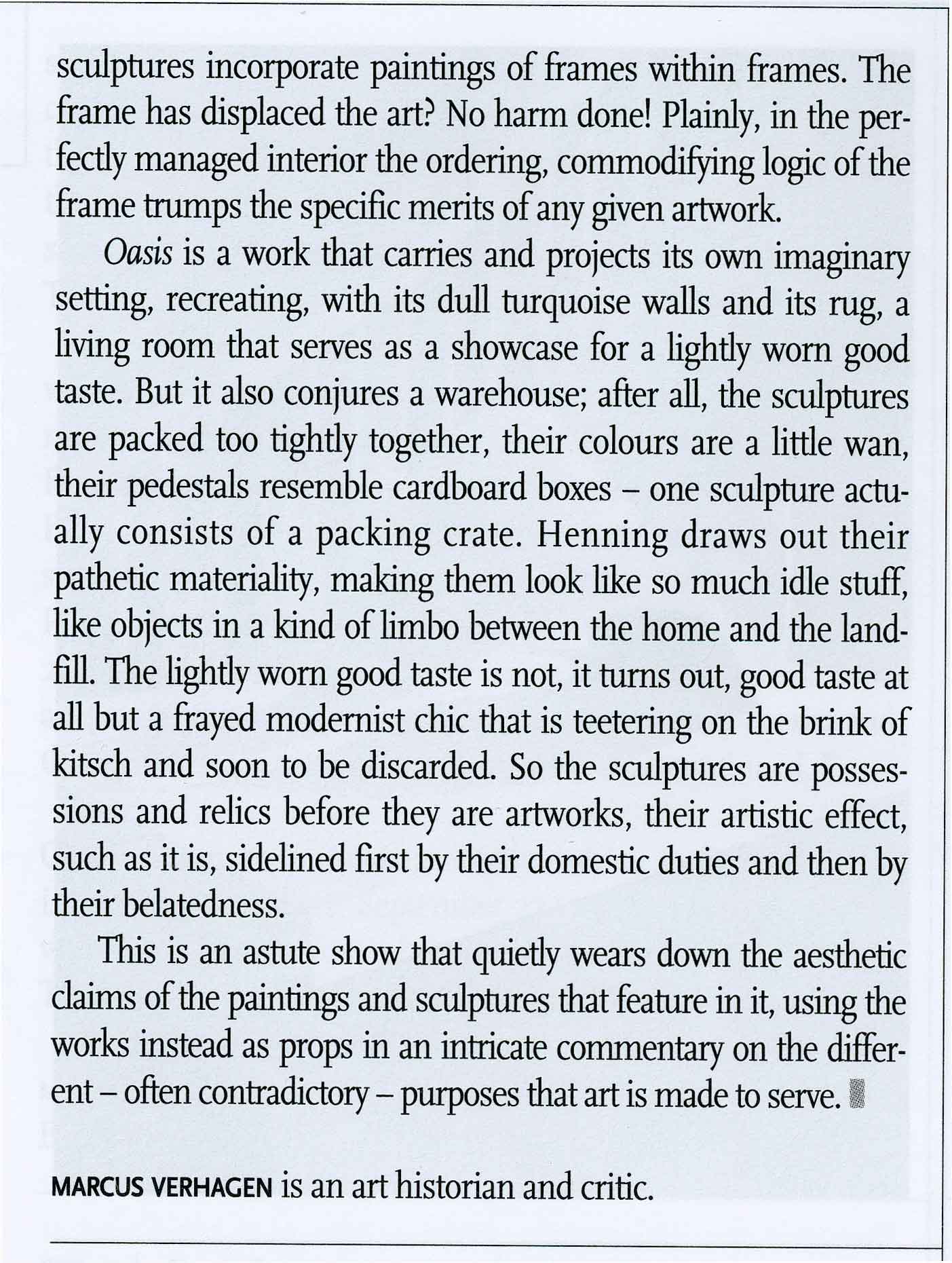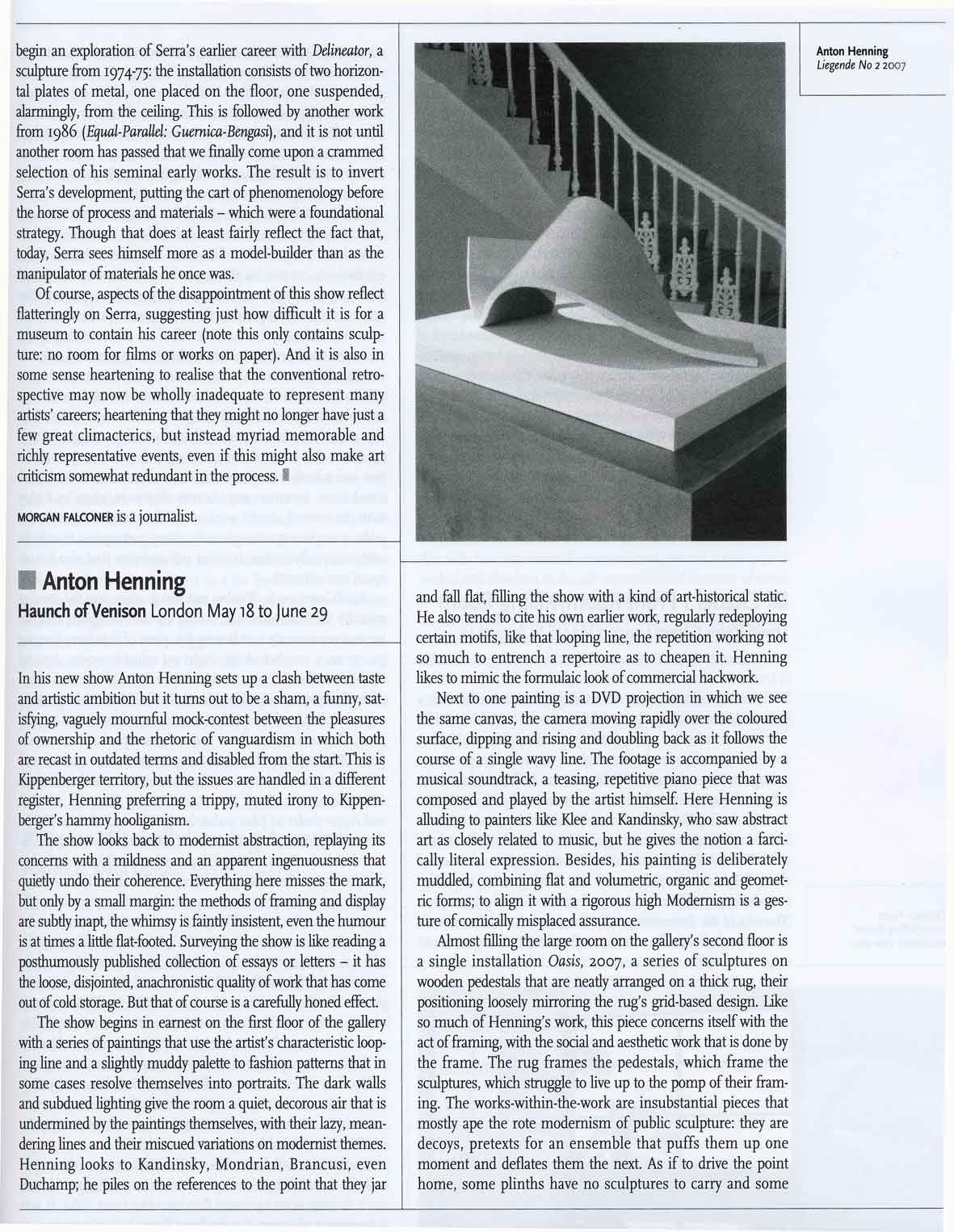 Verhagen, Marcus: "Exhibition Review: Anton Henning, Haunch of Venison, London May 18 to June 29, 2007", in Art Monthly, July - August, No. 308, pp. 37