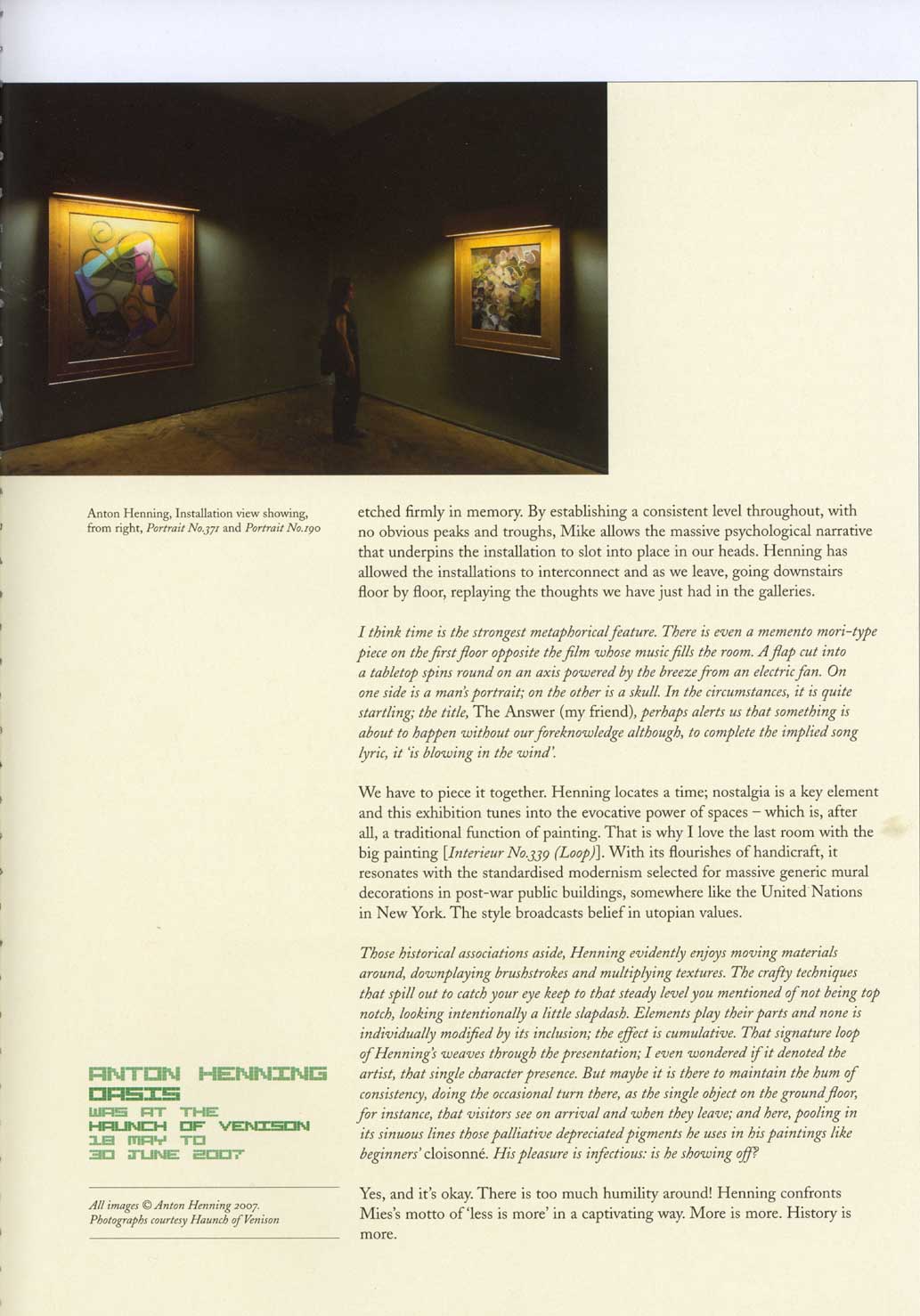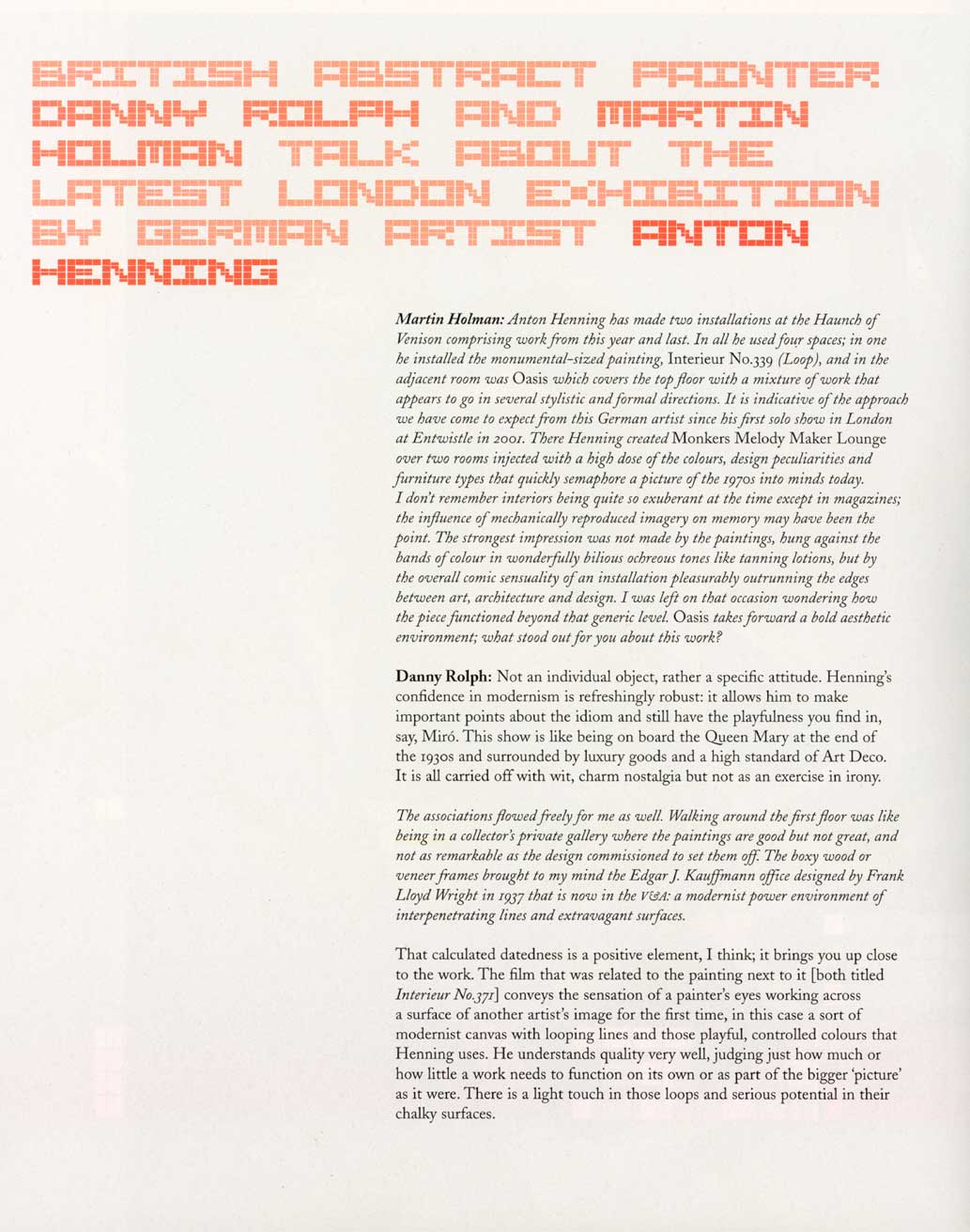 "British Abstract Painter Danny Rolph and Martin Holman Talk About The Latest London Exhibition By German Artist Anton Henning", in Miser & Now, ed. Keith Talent Gallery, London, issue ten 2007, pp. 58
